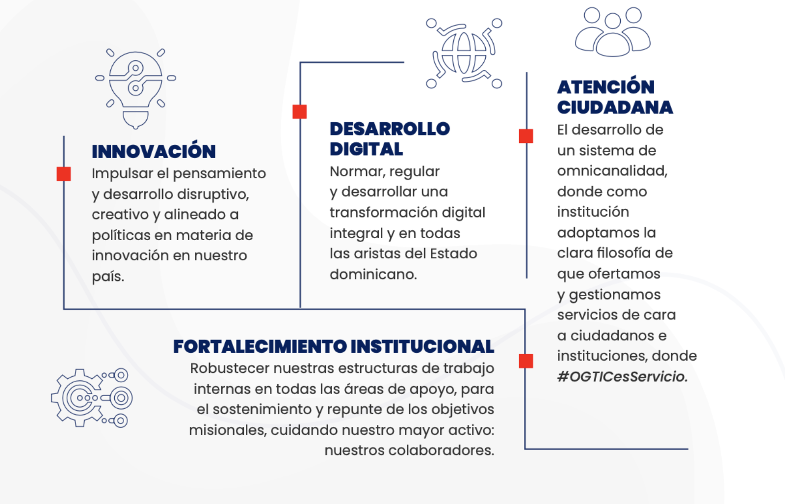 Uno de los pilares fundamentales de nuestra gestión ha sido conseguir que la ciudadanía sienta realmente que el gobierno está a su servicio. bajo la filosofía de “OGTIC es servicio, porque somos ciudadanos sirviendo a otros ciudadanos”, democratizando el acceso a los servicios públicos y mejorando su calidad.
