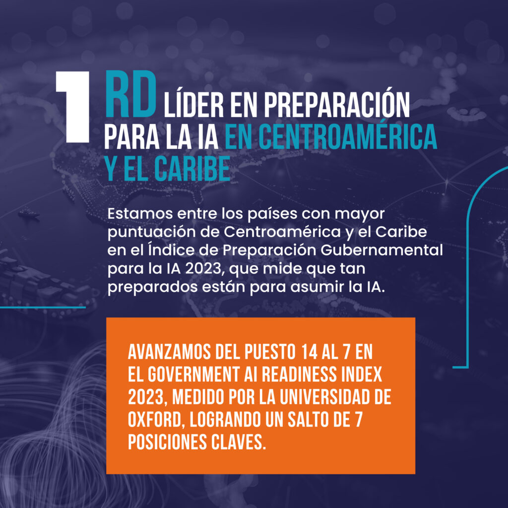 Durante el primer año de la ENIA, República Dominicana logró avanzar significativamente en el Government AI Readiness Index 2023. Pasamos del puesto 14 al 7, consolidándonos como uno de los países mejor preparados en Centroamérica y el Caribe para adoptar la inteligencia artificial. Este reconocimiento refleja el compromiso de nuestro gobierno en fortalecer las capacidades institucionales para implementar tecnologías de IA que mejoren los servicios públicos y promuevan la eficiencia administrativa.