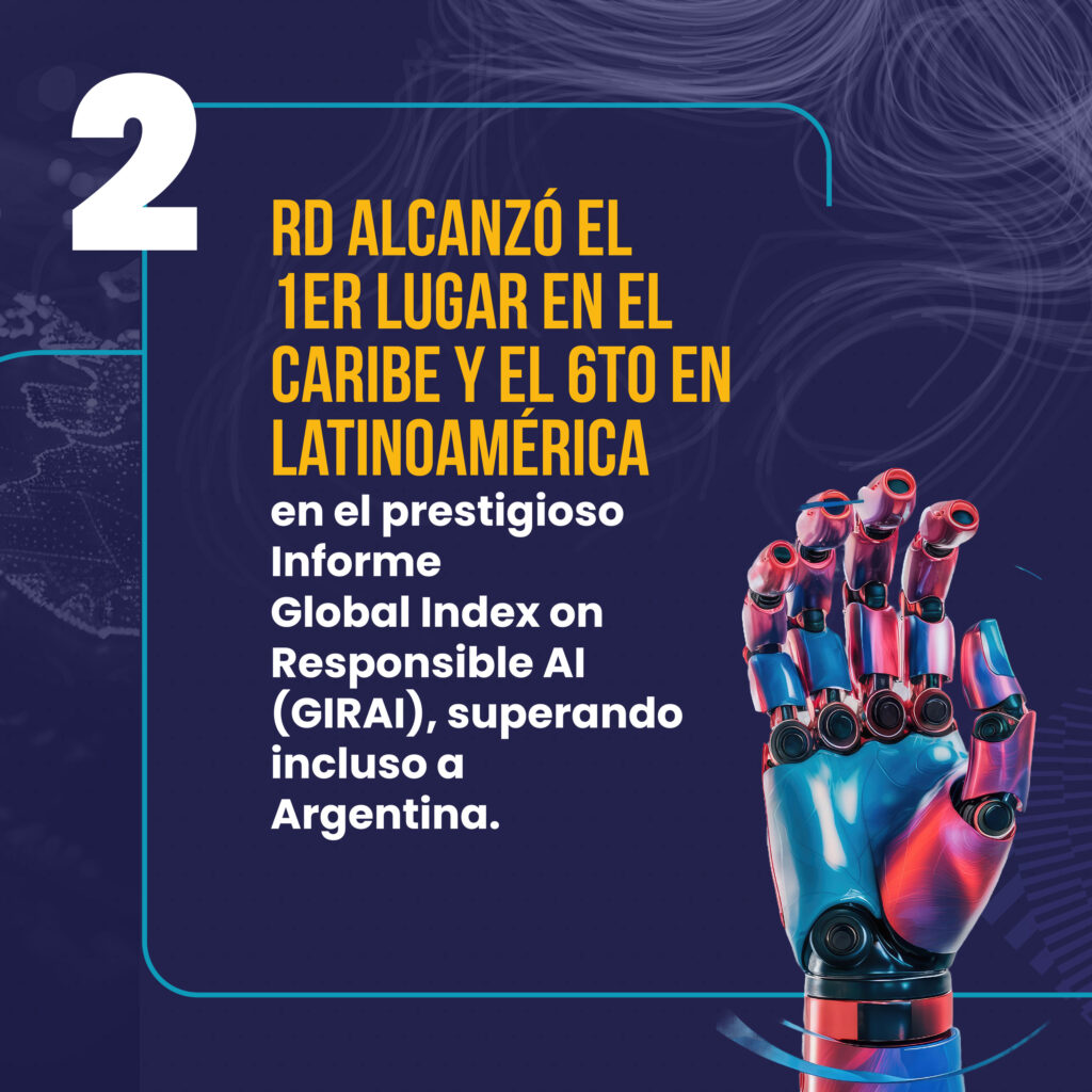 Gracias a la implementación de la ENIA, República Dominicana ha sido reconocida como el primer país del Caribe y el sexto en Latinoamérica en el Global Index on Responsible AI (GIRAI). Este índice, que evalúa la responsabilidad en la adopción de la IA, subraya nuestro enfoque en asegurar que las tecnologías de inteligencia artificial se utilicen de manera ética, con un claro compromiso con los derechos humanos y la transparencia. Superamos incluso a países como Argentina, lo que destaca nuestro liderazgo en la región.