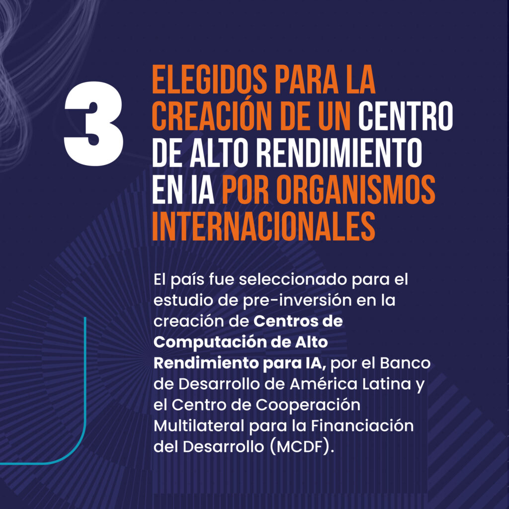 Otro logro destacado fue nuestra elección para participar en un estudio de pre-inversión para la creación de Centros de Computación de Alto Rendimiento para IA. Este estudio, liderado por el Banco de Desarrollo de América Latina y el Caribe y el Centro de Cooperación Multilateral para la Financiación del Desarrollo (MCDF), nos posiciona como un posible hub de innovación tecnológica en la región, ampliando nuestra capacidad de desarrollar soluciones avanzadas en inteligencia artificial.