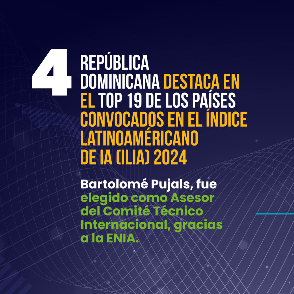 A nivel regional, fuimos uno de los 19 países convocados a participar en el Índice Latinoamericano de Inteligencia Artificial (ILIA) 2024. Este reconocimiento no solo muestra el avance de la ENIA, sino también la influencia de República Dominicana en la creación de políticas públicas orientadas a promover el uso responsable de la IA. Nuestro director general, Bartolomé Pujals, fue elegido asesor del Comité Técnico Internacional, consolidando nuestro liderazgo en este importante foro.