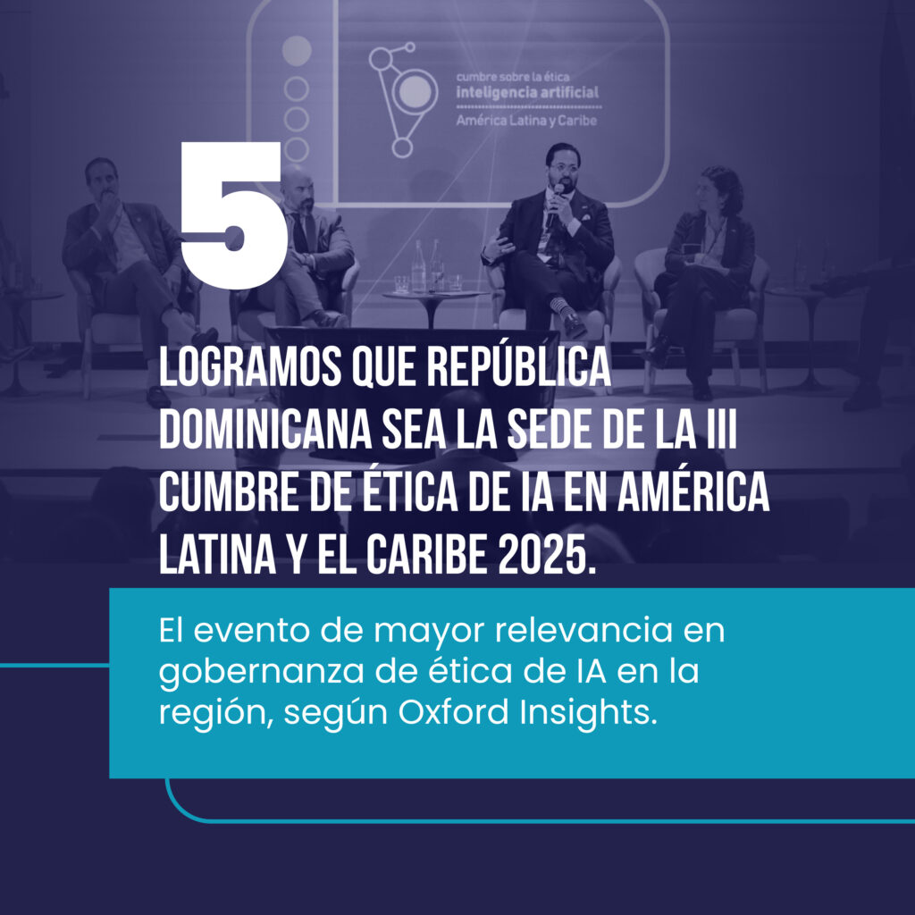 Uno de los logros más significativos es que República Dominicana será la sede de la III Cumbre de la Ética de la IA en América Latina y el Caribe en 2025. Este evento, considerado por Oxford Insights como el más importante en la gobernanza de la ética en la IA en la región, consolidará aún más nuestra posición como referente en el uso responsable y ético de la inteligencia artificial.