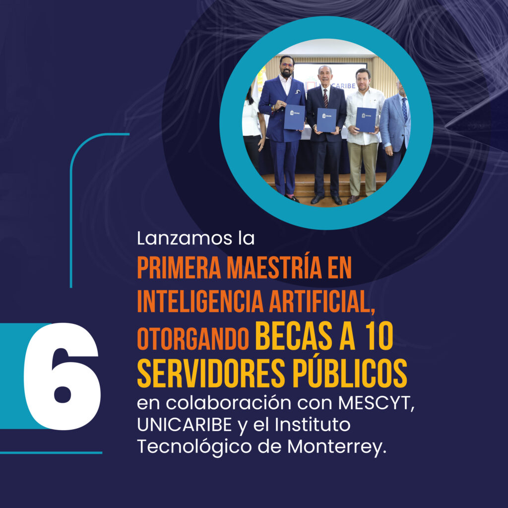 Uno de los grandes hitos alcanzados gracias a la ENIA ha sido el impulso en la formación académica. En colaboración con la MESCYT y UNICARIBE, lanzamos la primera maestría en inteligencia artificial junto con el Instituto Tecnológico de Monterrey, otorgando becas a 10 servidores públicos. Asimismo, la Universidad Autónoma de Santo Domingo (UASD) inauguró su programa de maestría en “Ciencia de Datos e Inteligencia Artificial”, un proyecto clave para formar a los futuros líderes tecnológicos del país.