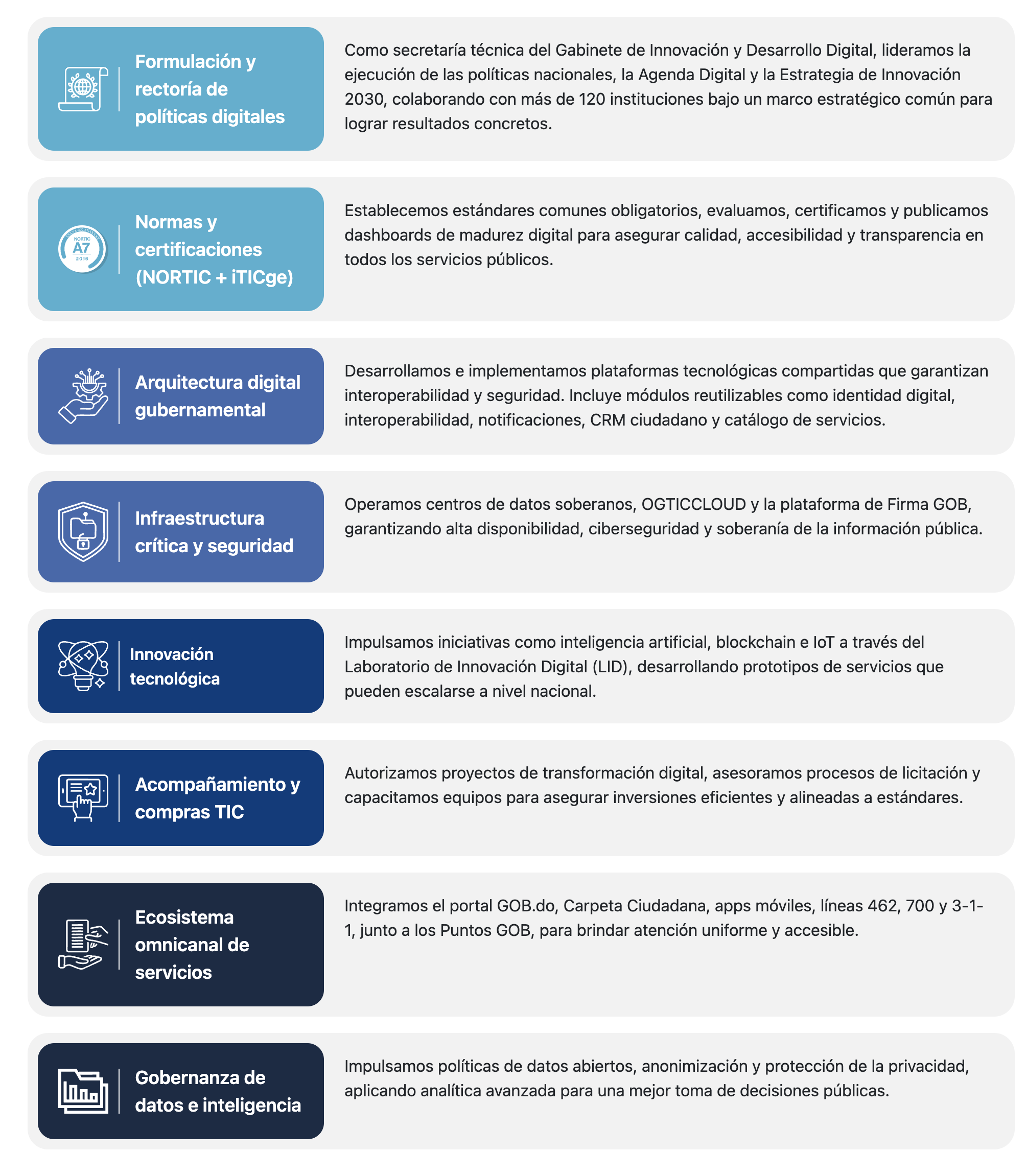 Misión: Impulsar la transformación digital del Estado Dominicano mediante soluciones tecnológicas interoperables, seguras y accesibles, para mejorar la eficiencia, la transparencia y la calidad en la prestación de los servicios públicos, beneficiando directamente al ciudadano. En la práctica, esto implica crear y gestionar plataformas digitales como firmas electrónicas, identidades digitales y sistemas de datos públicos que permitan interactuar con el gobierno sin papeles ni filas.